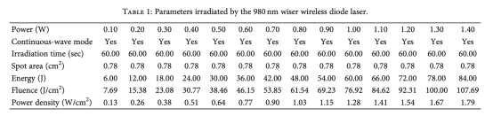1. 激光參數設計:采用980nm二極管激光(連續波模式),功率0.1–1.4W(0.1W梯度遞增),輻照60秒,光斑面積0.78cm2(表1)。