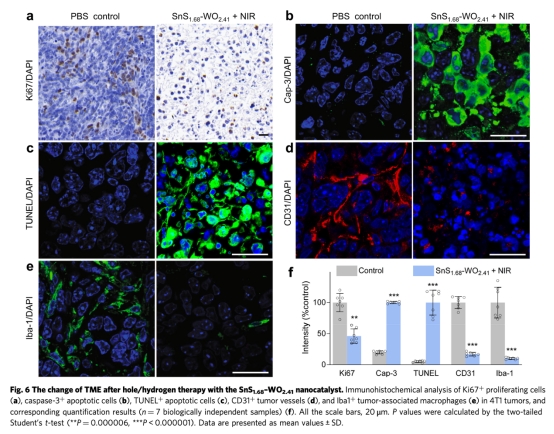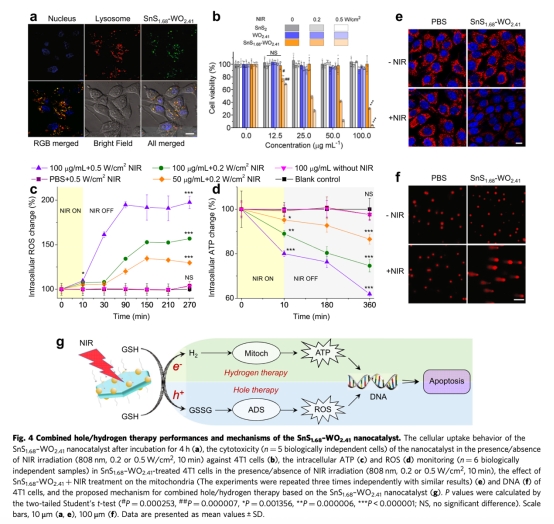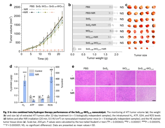 研究提出"無藥治療"新策略,開發Z型SnS?.??-WO?.??納米催化劑,在808 nm近紅外光(NIR)激發下同步產生氧化性空穴和氫氣分子。該催化劑無需藥物輔助,通過空穴持續消耗腫瘤內過表達的谷胱甘肽(GSH),同時催化生成氫氣分子。氫氣分子抑制癌細胞能量代謝,GSH消耗破壞腫瘤氧化還原平衡,二者協同誘導DNA損傷和細胞凋亡。體內外實驗證實該療法高效安全,腫瘤完全消退率達20%(圖5b),且無系統毒性。