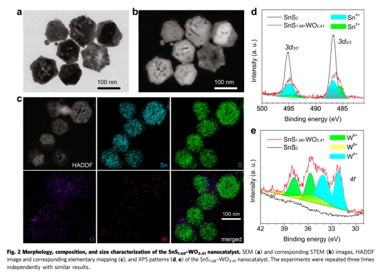 ? 構建Z型異質結:WO?.??納米點(強氧化性)負載于SnS?.??納米片(窄帶隙1.49 eV)表面,形成等離子體共振增強結構(圖2)。