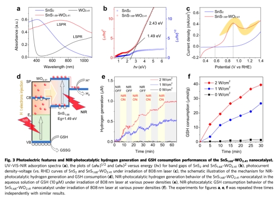 ? 近紅外響應機制:WO?.??局域表面等離子體共振(LSPR)產生熱電子注入SnS?.??,實現高效電荷分離(圖3c-d)。
