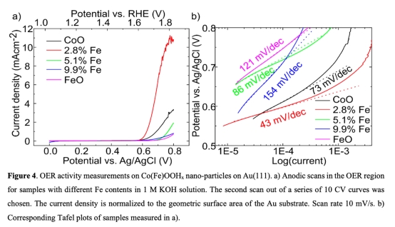 ? 2.8 at.% Fe樣品電流密度較純CoO提升3倍(6.5 vs. 1.9 mA/cm2)。