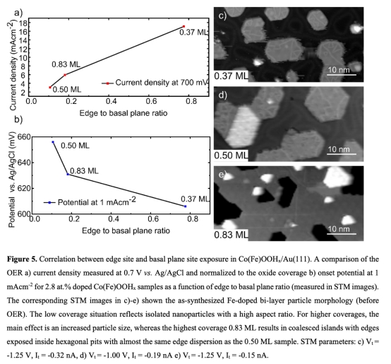 ? 調控納米顆粒覆蓋度(0.37–0.83 ML),證明OER活性與邊緣/基面位點比例呈線性正相關(圖5),確認邊緣位點為活性中心。