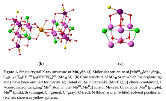 1. 簇結(jié)構(gòu)設(shè)計:合成Mn18Sr(圖1a)和Mn19兩種高核錳簇,前者以Sr2?替代后者的中心Mn2?,二者均含仿生立方烷單元{Mn?Cl?O?}(圖1c)和氧化還原活性配體HLMe(模擬酪氨酸Y161);
