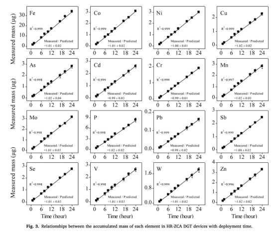 ? 溶液實驗驗證結合膠洗脫效率(表2:Se洗脫效率99.7%,P為87.6%)及DGT設備線性響應(圖3:16種元素積累量與時間線性相關,R2>0.997)。