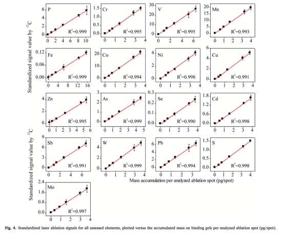 ? LA-ICP-MS校準曲線(圖4)顯示元素積累量與標準化信號線性關系(R2>0.99),分析精密度高(RSD<12%,表3)。