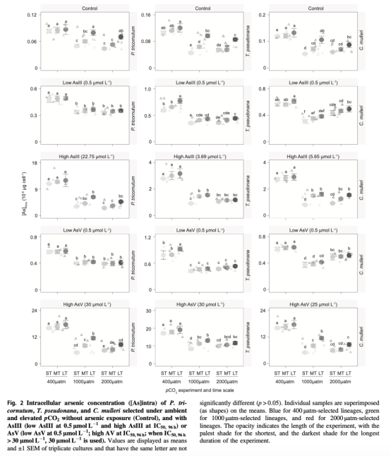 ? 數據:高pCO?組胞內砷積累減少(如1000 μatm組降低30%),且有機砷(DMA)比例上升。