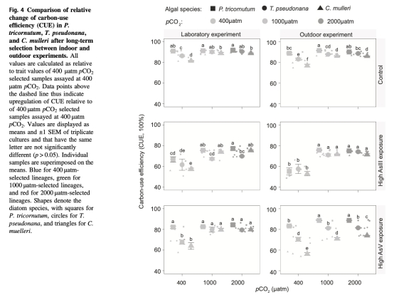 ? 數據:高pCO?馴化硅藻的CUE提升(凈光合/總光合比率增加),尤其在室外實驗中更顯著。