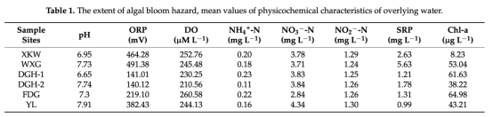 1. 水質(zhì)參數(shù)(表1):包括pH、ORP、DO、NH4+-N、NO3--N、NO2--N、SRP和Chl-a。研究意義:提供采樣點基礎(chǔ)環(huán)境特征,識別藻華程度與營養(yǎng)鹽濃度的關(guān)聯(lián)(如高藻站點FDG和YL的氮磷濃度更高),幫助理解藻華對水化學(xué)的影響。
