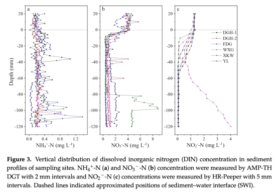 ? DIN組分(NH4+-N、NO3--N、NO2--N)(圖3):通過AMP-TH DGT和HR-peeper獲取高分辨率數(shù)據(jù)。研究意義:顯示氮組分在沉積物-水界面的擴散梯度(如NO3--N在SWI的沉降趨勢),揭示藻華對氮積累和遷移的直接影響。