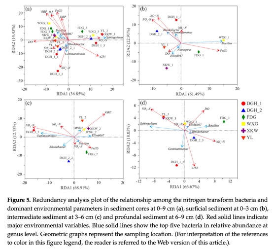 ? RDA分析(圖5):關(guān)聯(lián)環(huán)境因子與微生物群落。研究意義:確定主導(dǎo)控制因素(如NO3--N和sphingobium在深層沉積物的相關(guān)性),解釋氮循環(huán)的垂直異質(zhì)性。