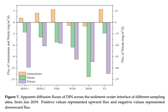 4. 擴散通量數(shù)據(jù)(圖7):計算DIN在沉積物-水界面的表觀擴散通量。研究意義:量化氮釋放或沉降方向(如高藻站點NH4+-N向上擴散),直接證明沉積物從匯向源的轉(zhuǎn)變,支持正反饋機制模型。