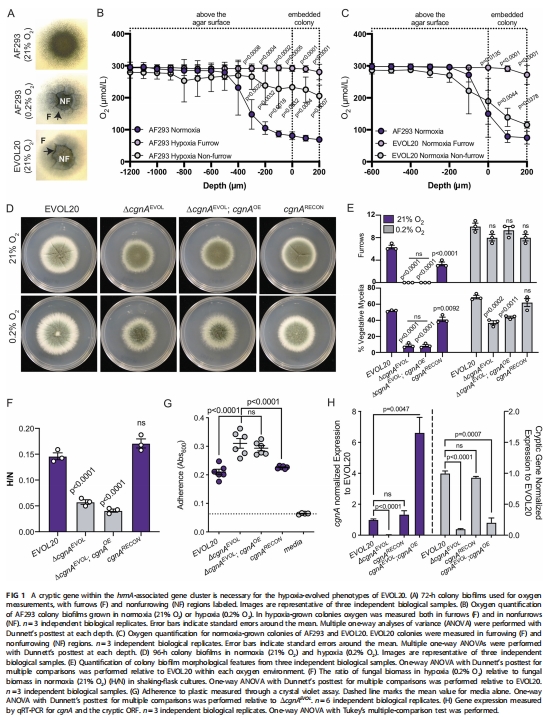發現缺氧菌落溝槽增加氧氣擴散(圖1B-C),與生物膜結構改變相關(圖1A)。