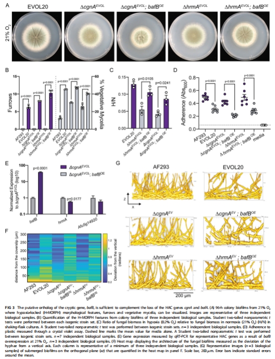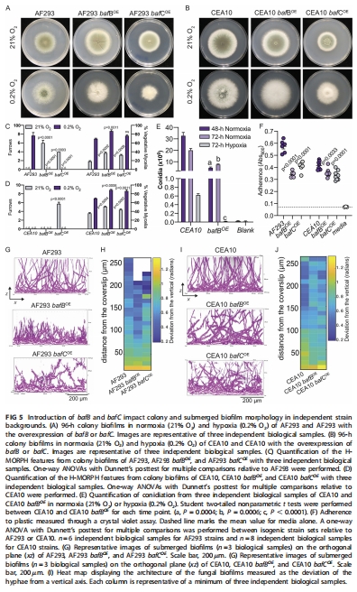 baf基因功能:bafA/bafB/bafC基因的表達可誘導菌落產生溝槽(furrows),形成缺氧鎖定形態(H-MORPH),改變生物膜結構(圖1D, 圖3A-B)。