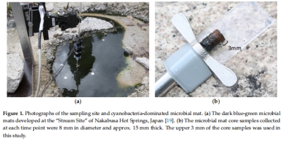 圖1:溫泉采樣點及微生物墊結構(藍藻層+綠彎菌層)。