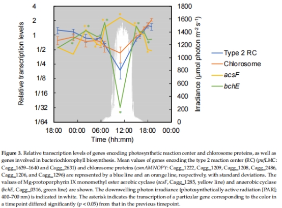 結果:夜間高表達(厭氧期合成色素),日間受O?抑制。