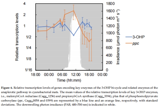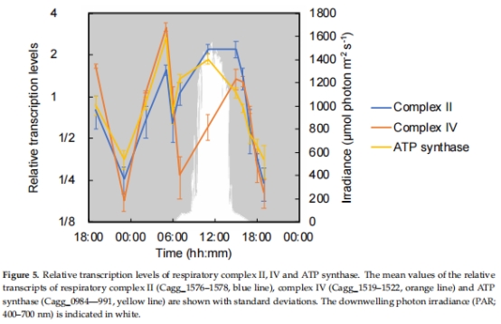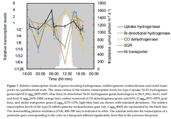 晨間微氧期(05:00):以化學混合營養代謝為主(同時利用H?、CO、有機碳),呼吸鏈基因(如氫酶、細胞色素氧化酶)高表達。
