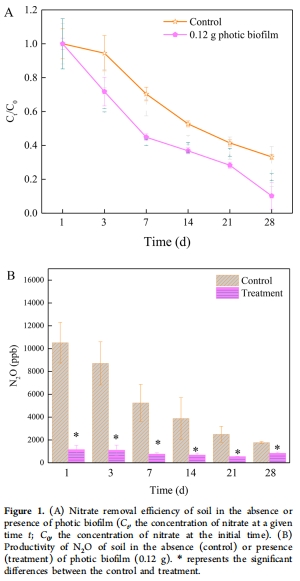 意義:光生物膜通過非DOM依賴機制加速硝酸鹽還原,且抑制N?O排放(圖1B),減少溫室氣體釋放。