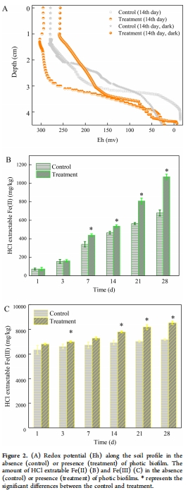 光生物膜使表層水Eh升高(295 mV vs. 278 mV),減緩深層Eh下降速率。