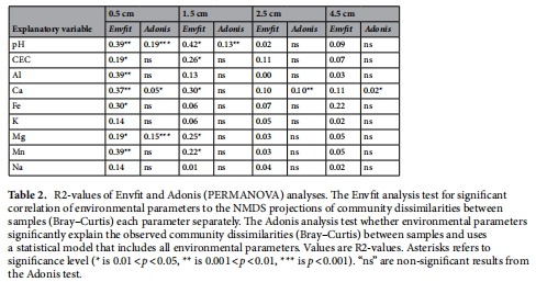 0.5 cm深度:pH、CEC、交換性Ca/Mg/Mn解釋19%群落變異(PERMANOVA, R2=0.19*)。