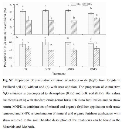 數(shù)據(jù)來源:30天累積排放量(圖S1),根際/非根際排放比例(圖S2)。