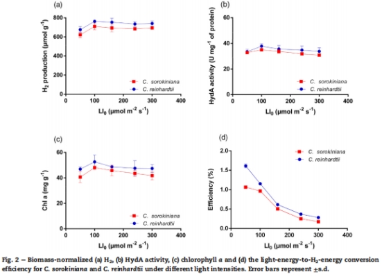 能量轉化效率峰值:50 μmol m?2 s?1時獲得最高光能-氫能轉化效率(LHCE)(C. reinhardtii:1.61%;C. sorokiniana:1.06%),隨光照增強而降低(圖2d)。