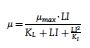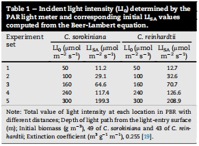 光抑制模型:采用Aiba方程擬合比生長速率(μ)與空間平均光強(LISA)的關系(式2),揭示光抑制閾值(C. reinhardtii:186 μmol m?2 s?1)(圖1b)。