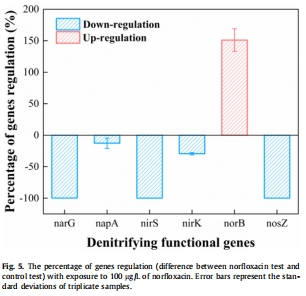 結果:100 μg/L諾氟沙星使narG表達下調62.3%,norB上調93.4%,norB/nosZ比率升高至93.41(對照為0.05)。