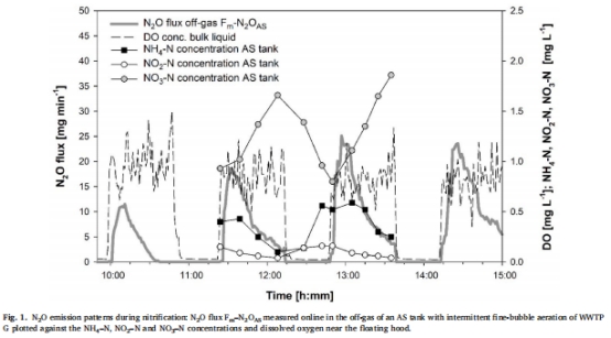 硝化是N?O主要來源:好氧階段N?O排放與進水氨氮(NH??)負荷峰值正相關(圖1-2),尤其在NH??濃度升高時排放激增。