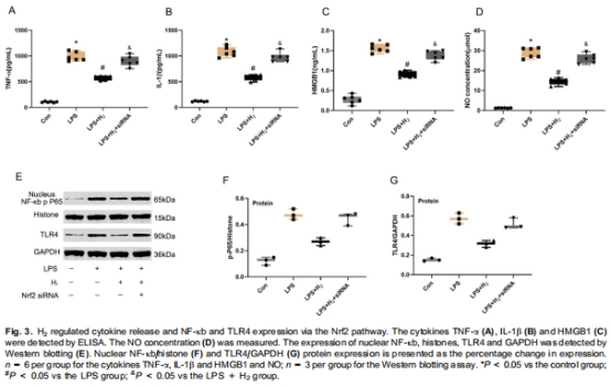 H?通過Nrf2通路抑制TLR4/NF-κB信號,減少促炎因子(TNF-α、IL-1β、HMGB1、NO)釋放(圖3, 圖5)。