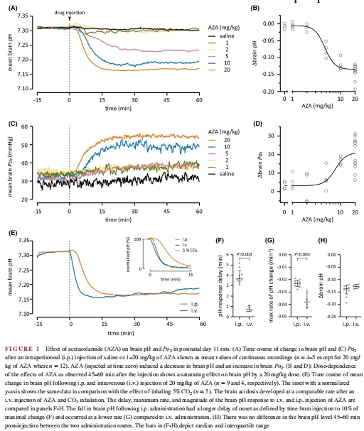 靜脈注射AZA/pH下降速度≈吸入5% CO?(圖1E),證實(shí)快速呼吸性酸中毒。