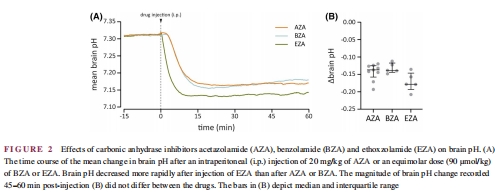 核心機(jī)制:CAIs抑制血管和血液中的碳酸酐酶,減緩CO?清除→升高血PCO?→腦pH降低0.14-0.17單位(圖1B, 2B),從而抑制神經(jīng)元興奮性。