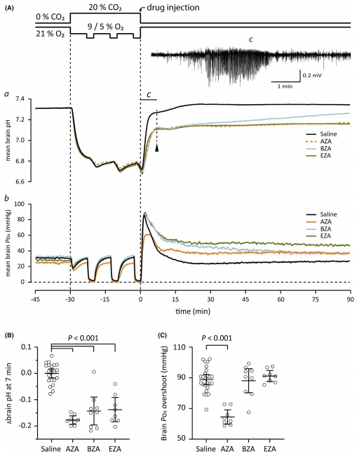 揭示CAIs給藥后腦pH↓0.14-0.17單位(圖1A, 2A),PO?↑16-21 mmHg(圖1C)。