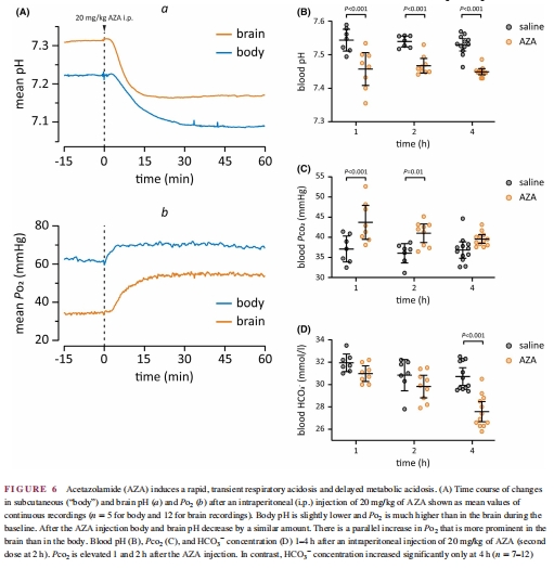 AZA注射后2 h內(nèi):血PCO?↑(呼吸性酸中毒),HCO??不變(圖6B-D)。