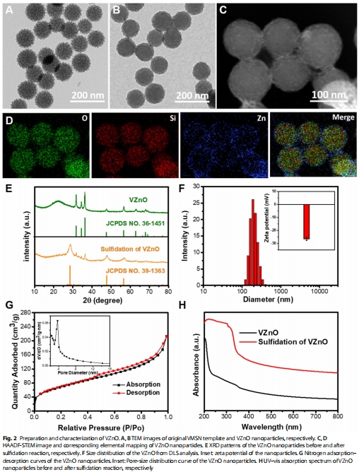VZnO的構(gòu)建與功能:以病毒樣介孔二氧化硅(VMSN)為載體的氧化鋅納米球(圖2A-D),通過反應(yīng) ZnO+HX2S