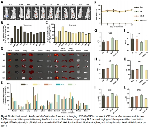 VZnO@FITC在CRC瘤內(nèi)富集(4h達(dá)峰)(圖4A-C);