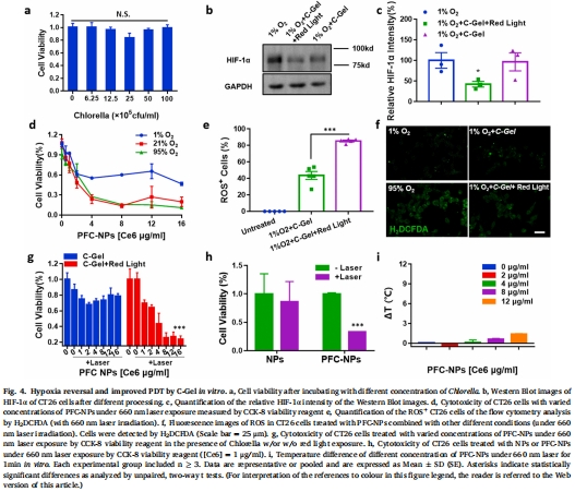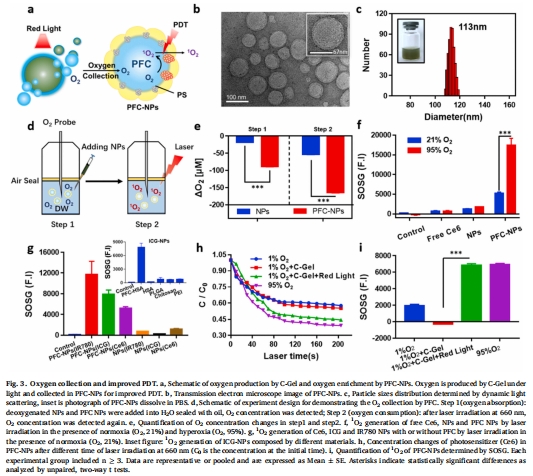 PFC納米顆粒(PFC-NPs)作為氧收集器,將氧富集于光敏劑周圍,提升單線態(tài)氧(1O?)產量(圖3f)。