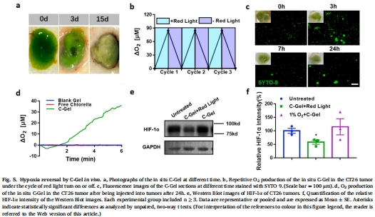 小球藻凝膠(C-Gel)在紅光(600–700 nm)照射下持續(xù)產氧,逆轉腫瘤缺氧(圖2d,e);