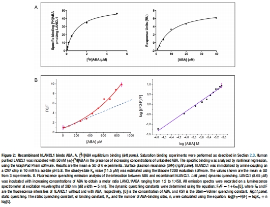 分子結(jié)合:人源重組LANCL1通過(guò)平衡結(jié)合實(shí)驗(yàn)、表面等離子共振(SPR)和熒光淬滅實(shí)驗(yàn)驗(yàn)證ABA結(jié)合能力(圖1-2);