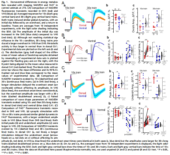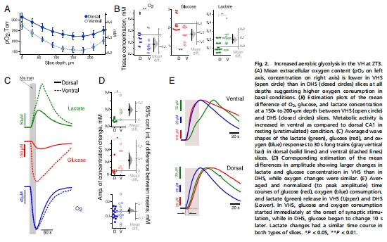海馬體背側(DH)與腹側(VH)在功能上存在差異:DH參與空間學習和記憶,VH涉及動機和情緒行為。本研究通過 離體代謝成像 和 分子傳感技術,揭示了海馬體能量代謝的時空異質性: