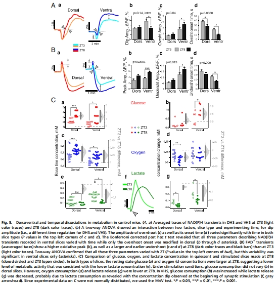 健康VH:ZT8時氧化代謝增強(FAD??峰值↑),糖酵解減弱(乳酸釋放↓)。