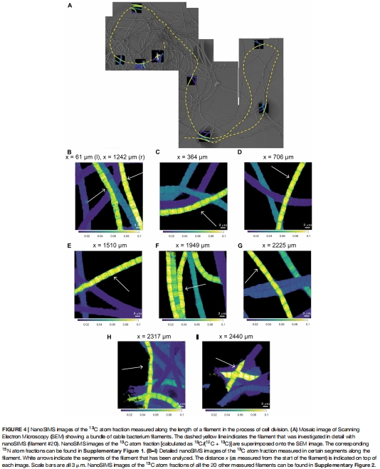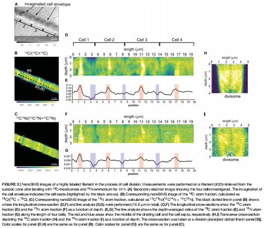 本研究通過結合雙標記穩定同位素探測(13C和1?N)、納米二次離子質譜(nanoSIMS)、熒光顯微鏡和基因組分析,揭示了電纜細菌(cable bacteria)獨特的細胞周期與生長機制: