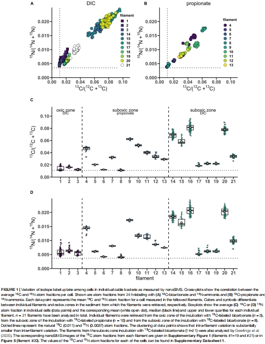 數據來源:nanoSIMS分析21根絲狀體(596個細胞)的13C/1?N原子分數。