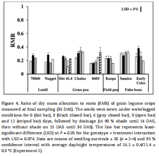 根質量比(RMR)在草豌豆中隨澇漬延長而升高(0.16→0.32),豌豆則下降(0.23→0.16)(圖4)。