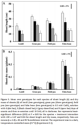 本研究評估了草豌豆(3基因型)、小扁豆(2基因型)、蠶豆(2基因型)和豌豆(1基因型)在萌發(fā)期對澇漬、低氧(1.0/2.5 kPa氧分壓)和無氧(氮氣環(huán)境)的耐受性差異: