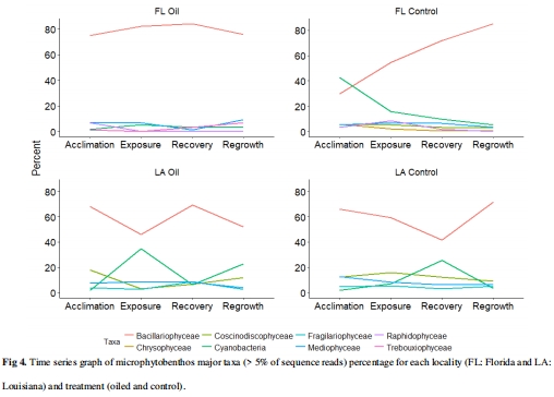 本研究通過中宇宙實(shí)驗(yàn)?zāi)M溢油事件,探究了長期暴露于石油污染(路易斯安那州錢德勒群島)與未暴露(佛羅里達(dá)州埃斯特羅灣)的海草床沉積物中微底棲植物群落的響應(yīng)差異: