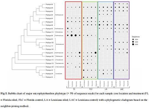 路易斯安那樣本中7個系統(tǒng)型(藍(lán)藻/硅藻)在暴露后豐度增加,佛羅里達(dá)僅1個硅藻系統(tǒng)型(假菱形藻屬)表現(xiàn)出抗性(表3)。