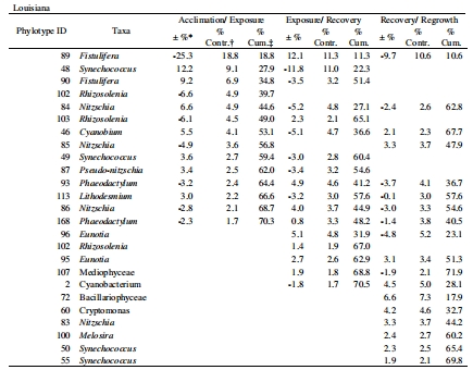 路易斯安那:7個系統(tǒng)型(如聚球藻Synechococcus、菱形藻Nitzschia)響應(yīng)暴露。