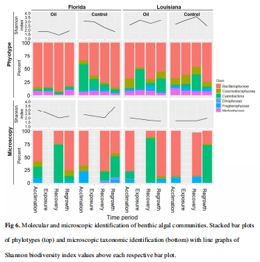 技術(shù)方法:結(jié)合23S rRNA高通量測序(靶向藍(lán)藻和真核微藻葉綠體)和顯微鏡分析,監(jiān)測石油暴露(50%水溶性油組分WAF)及恢復(fù)階段的群落動態(tài)。