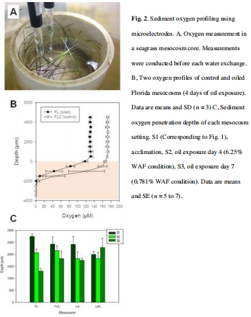 石油暴露使佛羅里達(dá)和路易斯安那沉積物的氧氣滲透深度分別減少52%和28%(圖2C)。