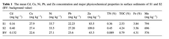 ? 數(shù)據(jù):S1和S2站點的TN(0.36-0.45%)、TOC(2.53-4.24%)、Fe/Mn含量及重金屬總量。